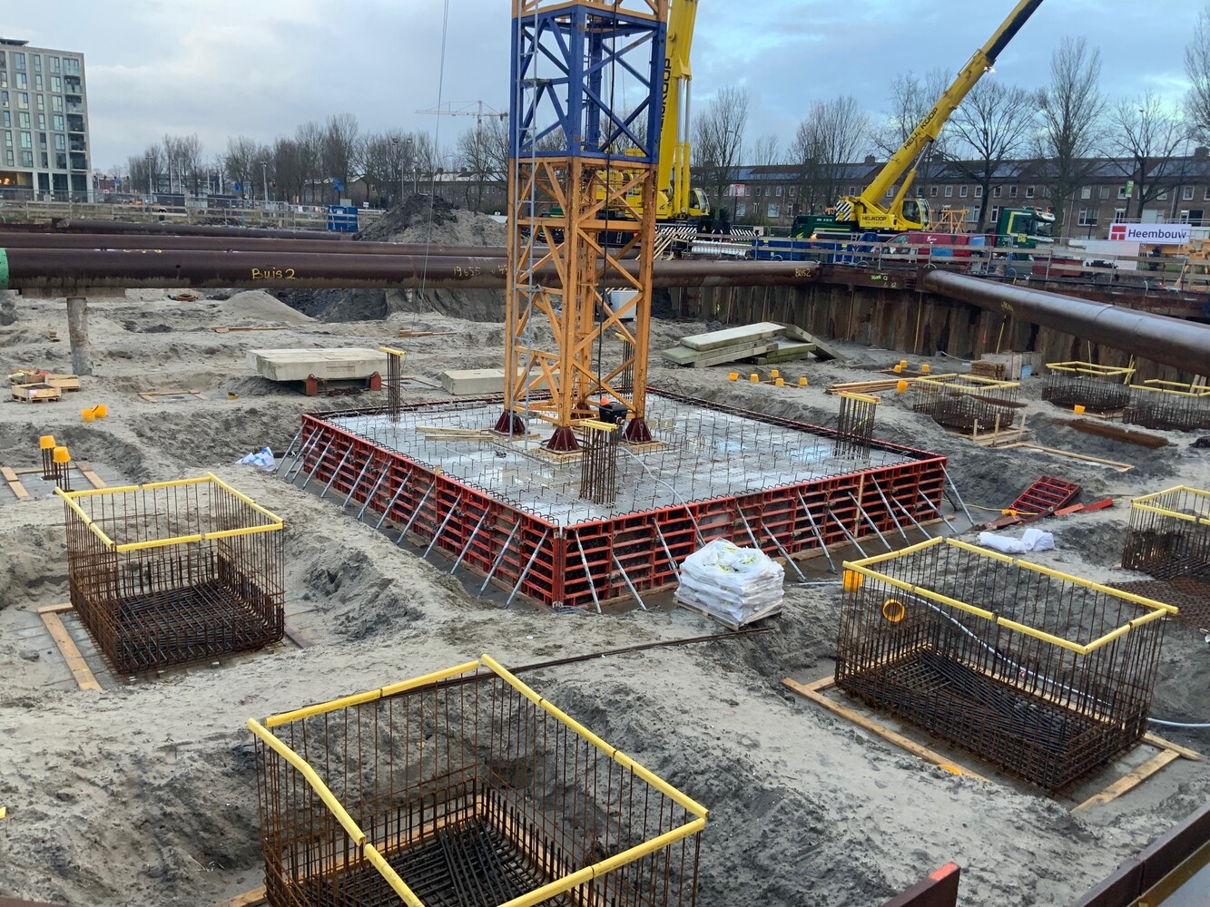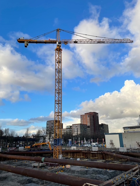 Begin januari is de eerste torenkraan aangebracht op een daarvoor speciaal gestorte funderingsondersteuning. Een tweede torenkraan volgt een aantal weken later. Het werk ligt goed op schema.